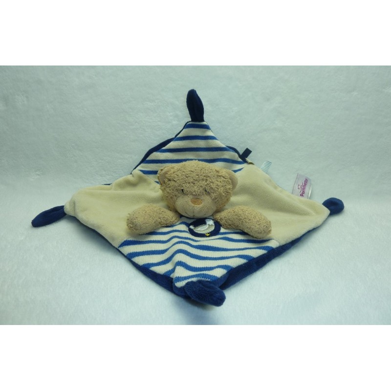 Description du doudou : Doudou plat ours. Coloris : beige, rayures bleu blanc, écusson canard. Doudou super doux. Etat : Bon état (marques d'usures). Produit original. . DOUDOU DIFFICILE A TROUVER