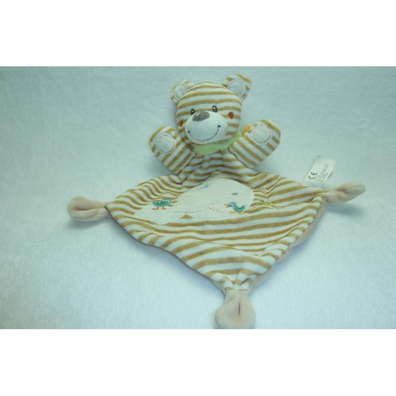 Description du doudou : Doudou plat ours Nicotoy, forme losange 32 cm environ de longueur. Coloris : rayures marron blanc, écharpe verte, motifs oiseau, canard etoiles. Doudou super doux. Etat : Neuf sans étiquette boutique. Produit original. DOUDOU DIFFICILE A TROUVERRecipient :