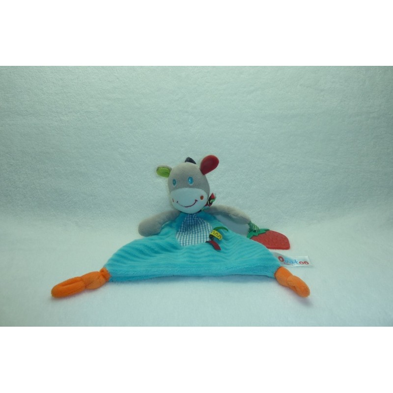 Description du doudou : Doudou plat cheval, forme triangle 25 cm environ de hauteur, anneau de dentition fraise, 2 nouages. Coloris principal : turquoise. Doudou super doux. Etat : Très bon état : le doudou est impeccable mais quelques traces de morsures sur l'anneau de dentition. Produit original. DOUDOU DIFFICILE A TROUVERRecipient :