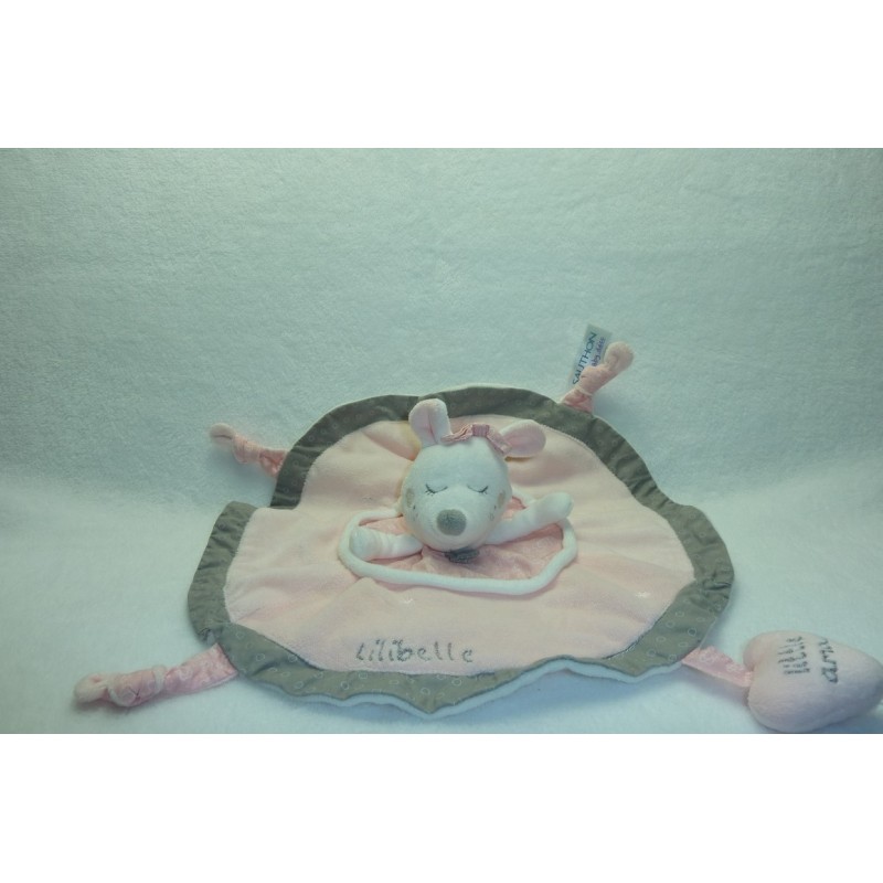 Description du doudou : Doudou plat, souris, forme ronde, 28 cm environ de large, petit coeur grelot, 3 nouages. Coloris : rose, blanc, gris. Doudou super doux. Etat : Neuf sans étiquette boutique. Produit original. DOUDOU DIFFICILE A TROUVERRecipient :
