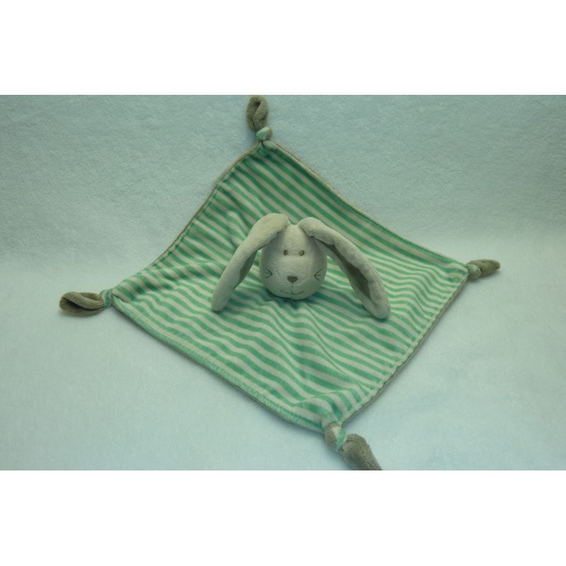 Description du doudou : Doudou plat lapin, 22x25 cm environ, 4 nouages . Coloris : rayures vert blanc, verso marron taupe . Doudou super doux. Etat : Très bon état (étiquette de la marque coupée), produit original. DOUDOU DIFFICILE A TROUVERRecipient :