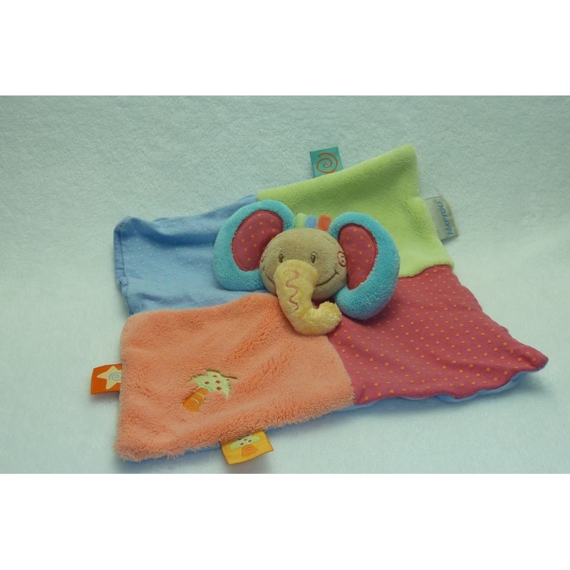 Description du doudou : Doudou plat éléphant de 25x25 cm environ. Coloris : vert, saumon, tissu pois, bleu. Doudou super doux. Etat : Comme neuf. Produit original. DOUDOU DIFFICILE A TROUVER