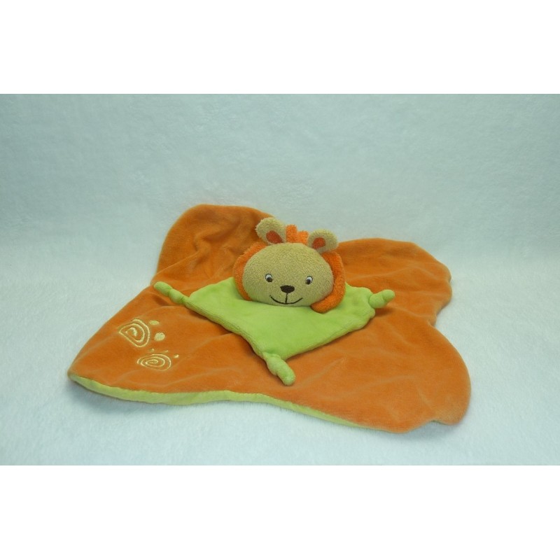 Description du doudou : Doudou plat lion de 24 cm environ de large, grelot. Coloris : vert, orange. Etat : Bon état (petites taches au verso) . Produit original. DOUDOU DIFFICILE A TROUVERRecipient :