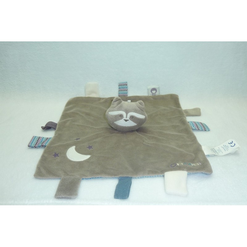 Description du doudou : Doudou plat chat de 26x26 cm environ, bordé d'étiquettes dont des bruissantes. Coloris : marron, tissu imprimé triangles au verso, motif : lune étoiles. Etat : Neuf sans étiquette boutique. Produit original. DOUDOU DIFFICILE A TROUVER