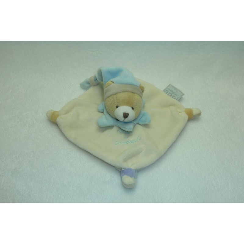 Description du doudou : Doudou plat ours de 16x15 cm environ. Coloris : écru, taupe au verso, bonnet et collerette bleu turquoise. ATTENTION DE BIEN VERIFIER DOUDOU CAR PLUSIEURS MODELES ET COULEURS POUR CET ARTICLE. Etat : Neuf sans étiquette boutique. Produit original. DOUDOU DIFFICILE A TROUVER