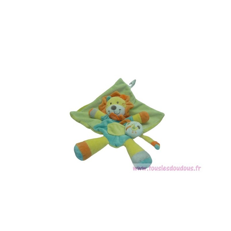 Description du doudou : Doudou plat lion de 22x20 cm environ. Coloris :vert, turquoise. Doudou super doux. Etat : Comme neuf. SOS DOUDOU DIFFICILE A TROUVER.