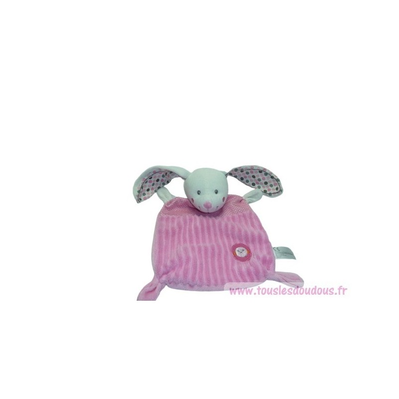 Description du doudou : Doudou plat lapin de 20 cm environ sans les oreilles. Coloris : rose,pois. Doudou super doux. Etat : Comme neuf (étiquette de la marque coupée). SOS DOUDOU DIFFICILE A TROUVER.