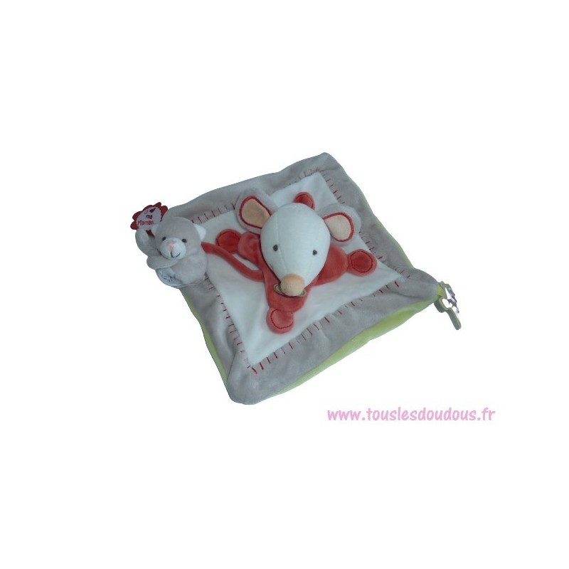 Doudou plat souris carré de 22x22 cm environ, gris rouge vert blanc. Etat : Bon état (mais taches persistante au lavage sur le visage l'étiquette Ma Maman coupée). SOS DOUDOU TRES DIFFICILE A TROUVER.Recipient :