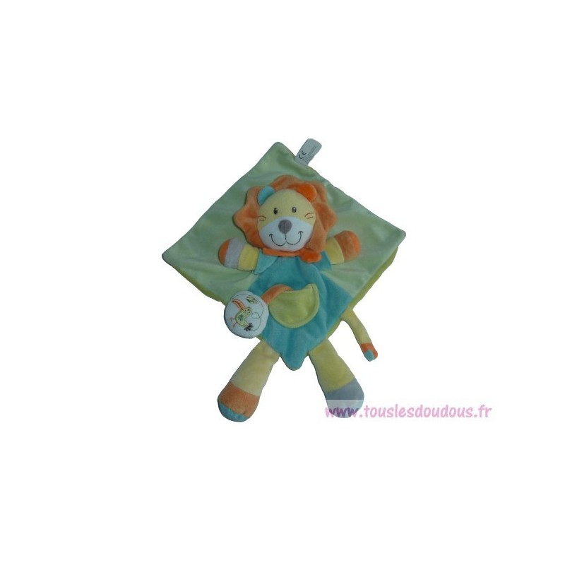 Doudou plat lion 20x20 cm environ, turquoise vert orange. Etat : Très bon état. SOS DOUDOU DIFFICILE A TROUVER.