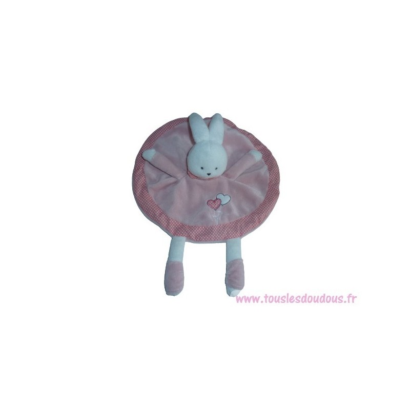 Doudou plat lapin forme ronde de 22 cm environ, rose petits pois coeur. Etat : Très bon état. SOS DOUDOU DIFFICILE A TROUVER.Recipient :
