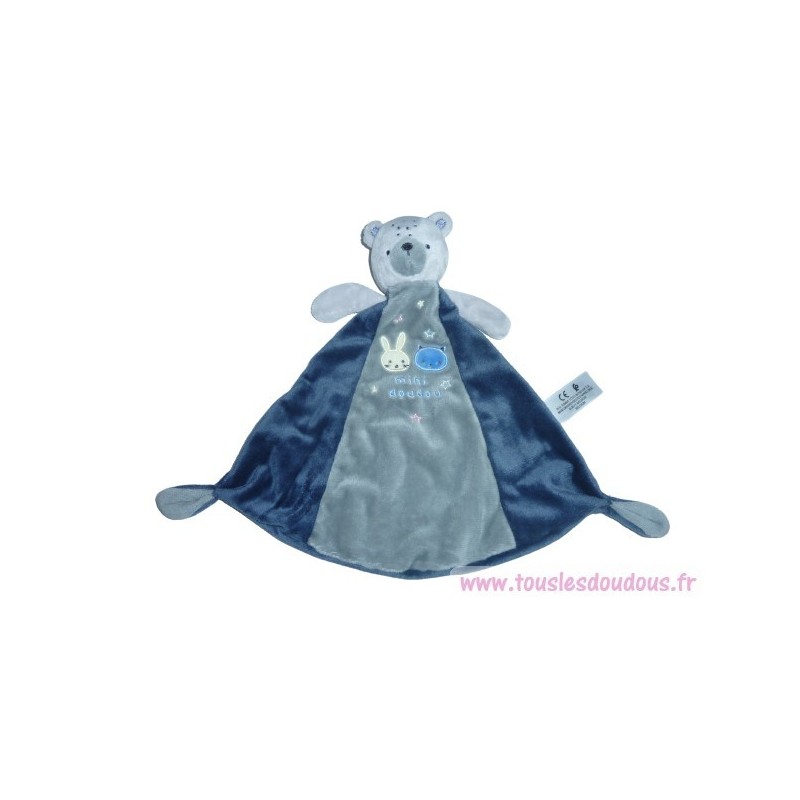 Doudou plat ours forme triangle 24 cm environ, bruissage dans les bras, bleu gris, motifs : lapin ours étoiles. Etat : Neuf sans étiquette boutique. DOUDOU DIFFICILE A TROUVER.Recipient :