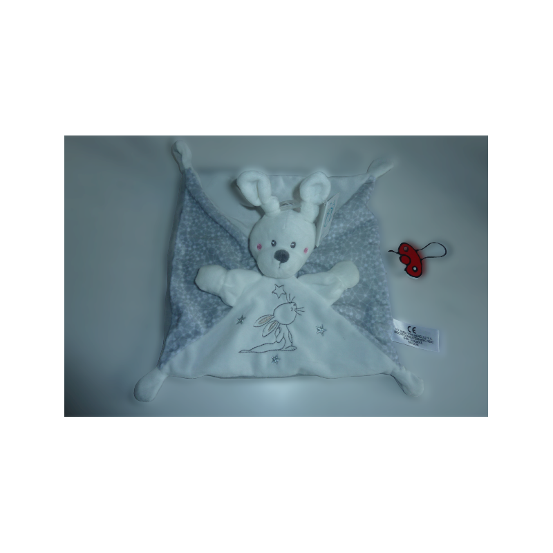 Doudou plat lapin 25x25 cm environ, blanc gris motif lapin étoiles. Etat : Neuf. SOS DOUDOU DIFFICILE A TROUVER.