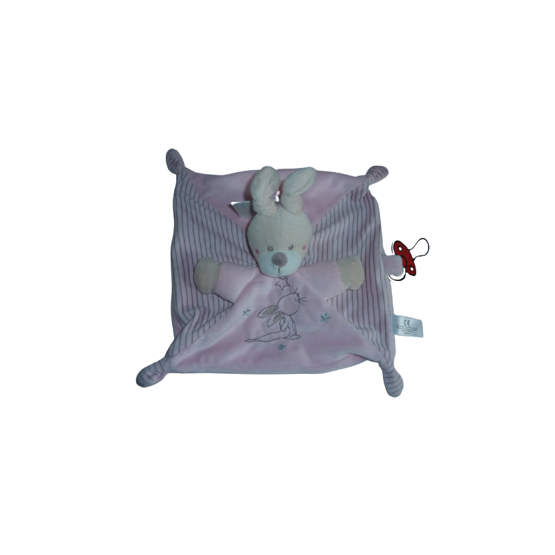Doudou plat lapin 24x24 cm environ, rose motif lapin étoiles. Etat : Neuf. SOS DOUDOU DIFFICILE A TROUVER.
