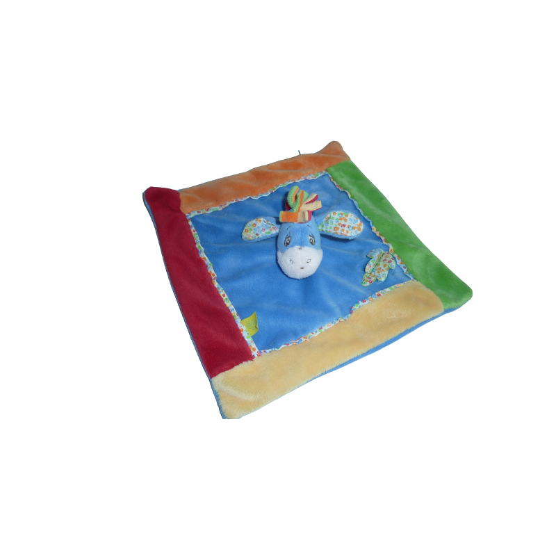 Doudou plat âne 26x25 cm environ, multicolore. Etat : Comme neuf (étiquette d'informations coupée). SOS DOUDOU DIFFICILE A TROUVER.