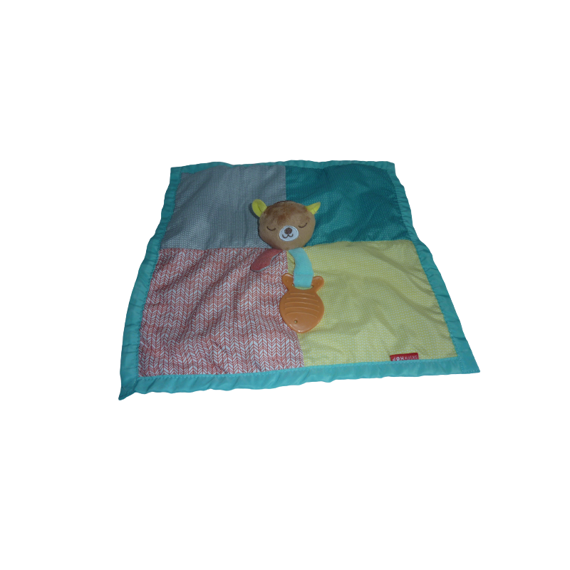 Doudou plat ours 36x36 cm environ, anneau de dentition, multicolore. Etat : Comme neuf. DOUDOU DIFFICILE A TROUVER.Recipient :