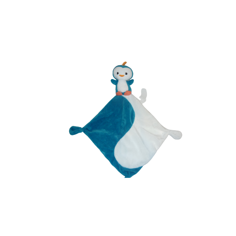 Doudou plat pingouin forme losange 38 cm environ, turquoise blanc. Etat : Très bon état général (micro taches au verso, rien de méchant). DOUDOU DIFFICILE A TROUVER.