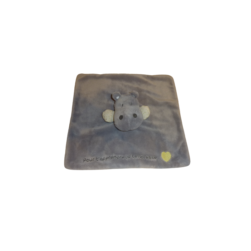 Doudou plat hippopotame 26x25 cm environ, gris. Etat : Comme neuf (étiquette de la marque coupée). DOUDOU DIFFICILE A TROUVER.
