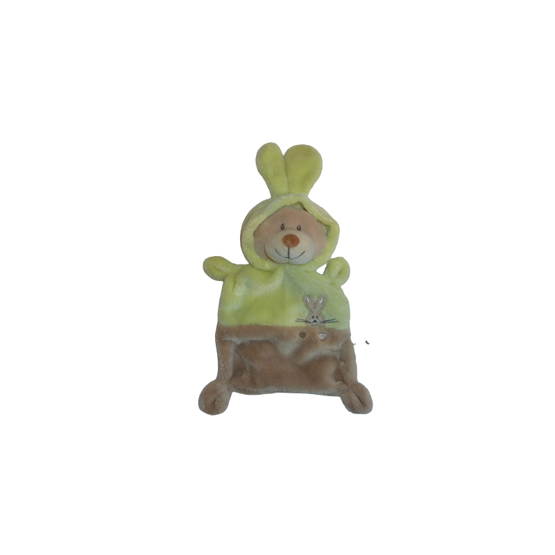 Doudou plat ours déguisé en lapin :32 cm environ tout compris, marron vert. Etat : Comme neuf. DOUDOU DIFFICILE A TROUVER.