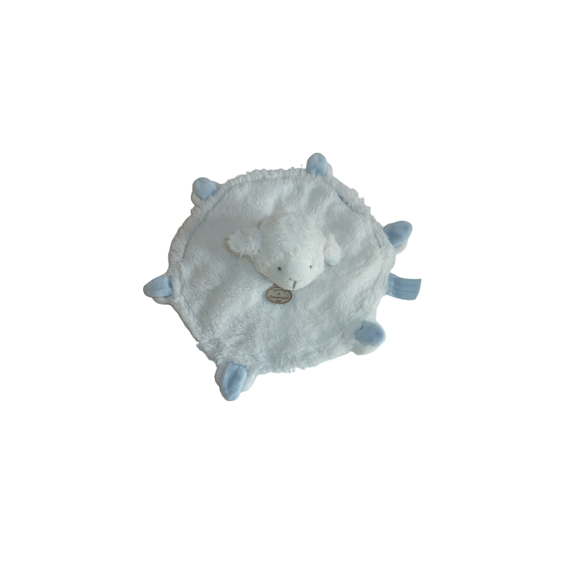 Doudou plat mouton 24 cm environ, blanc bleu. Etat : Très bon état. DOUDOU DIFFICILE A TROUVER.