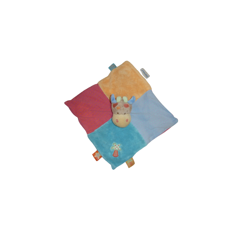 Doudou vache plat 25x26 cm environ multicolore. Etat : Bon état. DOUDOU DIFFICILE A TROUVER.