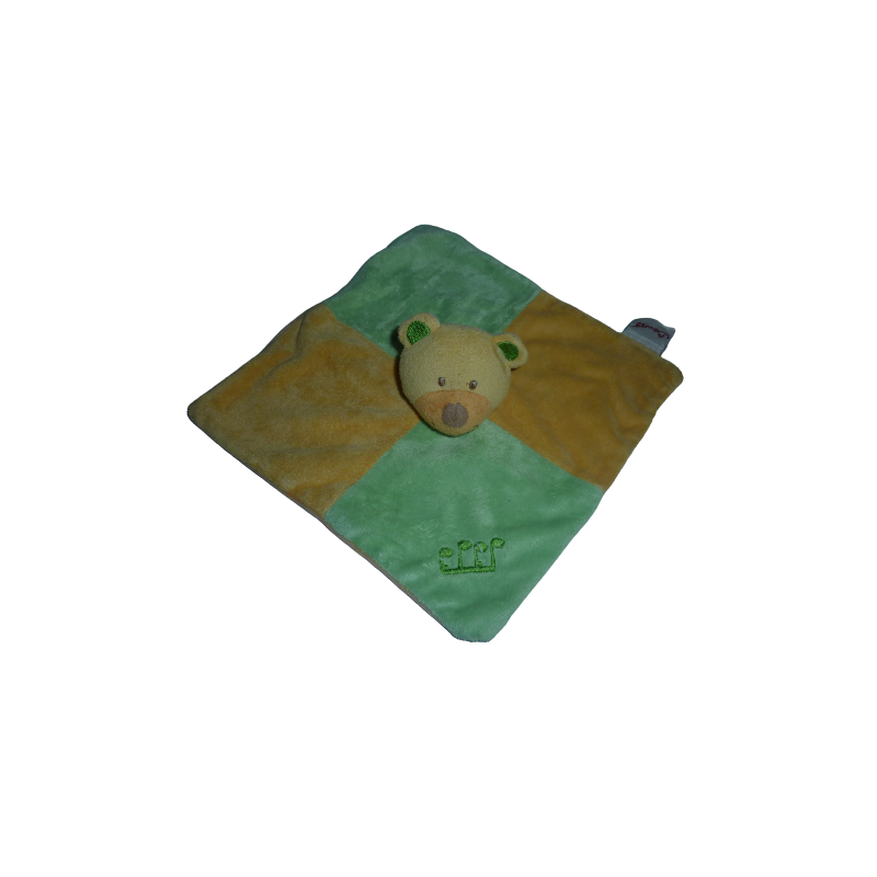 Doudou plat ours 21x21 cm environ, vert orange jaune note de musique brodée. Etat : Très bon état. DOUDOU DIFFICILE A TROUVER.Recipient :