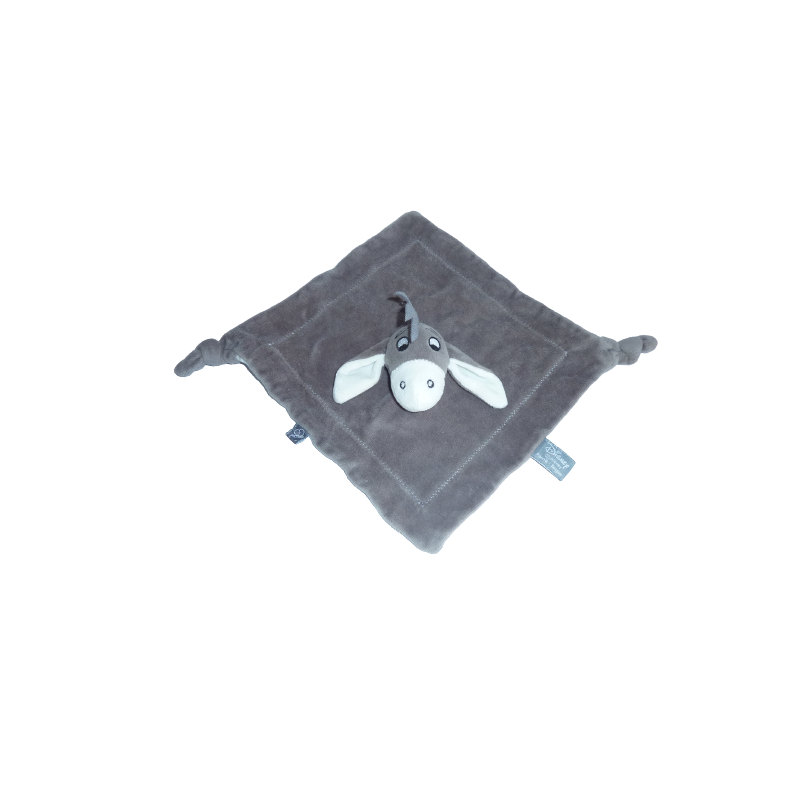 Doudou plat Bourriquet, gris blanc, 2 nouages, 22x22 cm environ. Etat : Neuf sans étiquette boutique. DOUDOU DIFFICILE A TROUVER.
