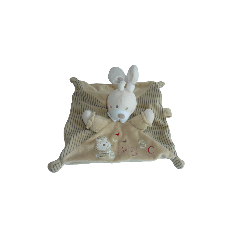Doudou plat lapin 26x26 cm environ, attache tétine par velcro, marron motifs ABC. Etat : Très bon état. DOUDOU DIFFICILE A TROUVER