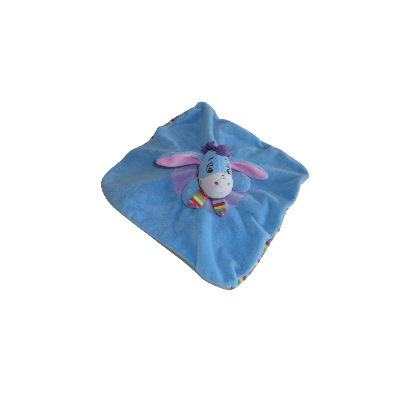 Doudou plat âne Bourriquet 23x23 cm environ, bleu violet. Etat : Très bon état. DOUDOU DIFFICILE A TROUVER