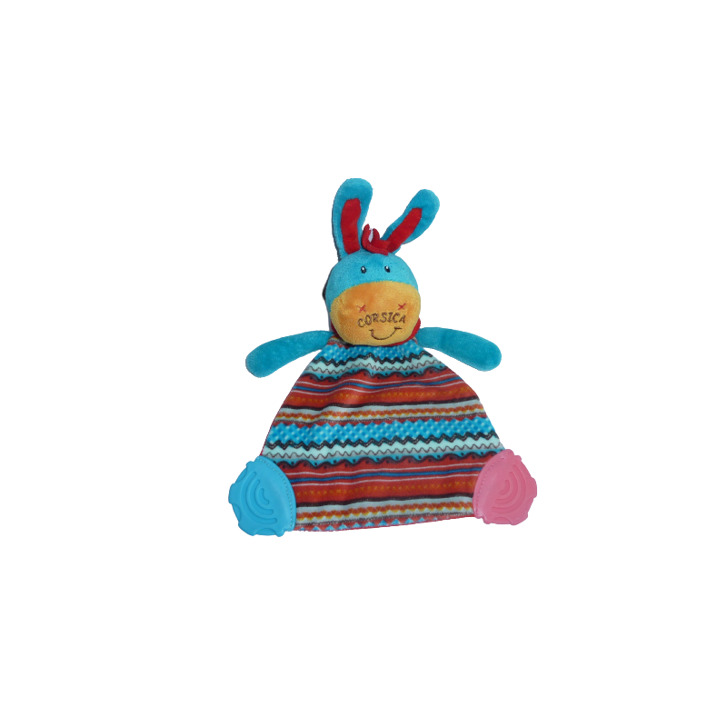 Doudou plat âne 32 cm environ, grelot, anneaux de dentition, matière bruissante, multicolore. Etat : Très bon état. DOUDOU DIFFICILE A TROUVERRecipient :
