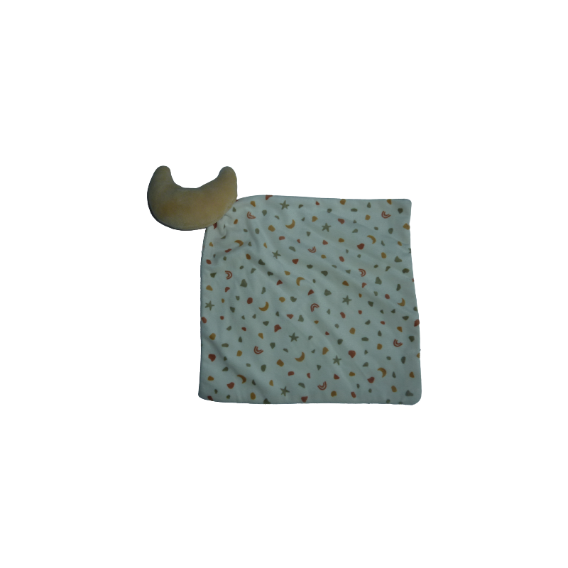 Doudou plat lune 40 cm environ, écru marron motifs. Etat : Comme neuf (étiquette de la marque coupée). DOUDOU DIFFICILE A TROUVER.