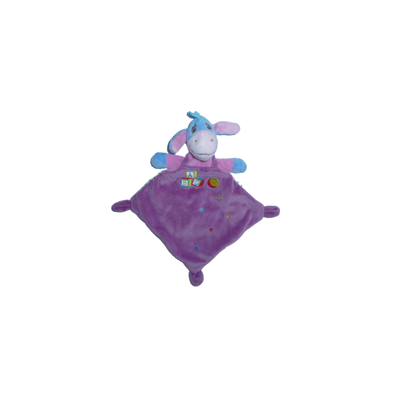 Doudou plat âne Bourriquet forme losange 32 cm environ, violet motif s étoiles ABC. Etat : Neuf sans étiquette boutique. DOUDOU DIFFICILE A TROUVER