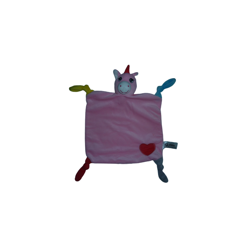 Doudou plat licorne27 cm environ de longueur, rose, 4 nouages, cœur rouge. Etat : Neuf. DOUDOU DIFFICILE A TROUVER
