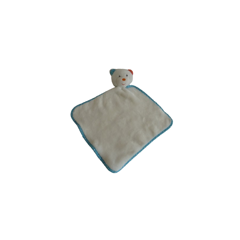 Doudou ours plat forme losange 39 cm environ, grelot, blanc contour bleu à pois blanc. Etat : Comme neuf. DOUDOU DIFFICILE A TROUVER