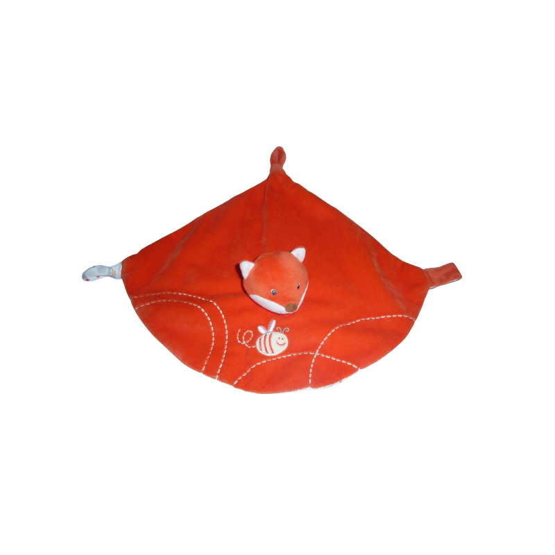 Doudou plat renard 42 cm environ de large, 2 nouages, velcro pour tétine, orange motif abeille et verso blanc imprimé. Etat : Neuf sans étiquette boutique. DOUDOU DIFFICILE A TROUVER