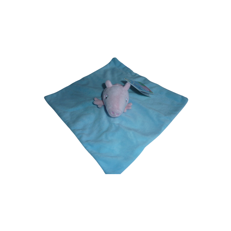 Doudou plat cochon 27x27 cm environ bleu et motifs au verso. Etat : Neuf. DOUDOU DIFFICILE A TROUVER