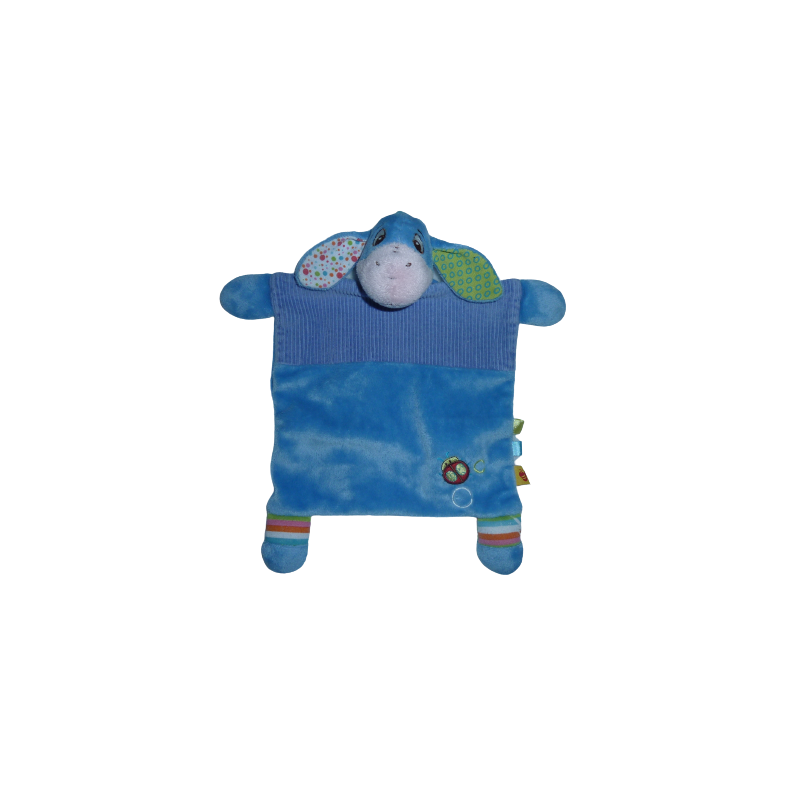 Doudou plat âne Bourriquet 32 cm environ, bleu violet motifs. Etat : Comme neuf. DOUDOU DIFFICILE A TROUVER