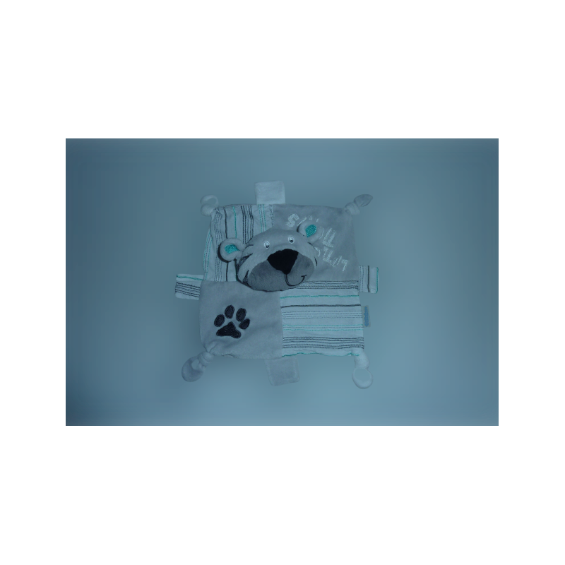 Doudou plat tigre 18x18 cm environ, 4 nouages, gris blanc rayures Etat : Comme neuf. DOUDOU DIFFICILE A TROUVERRecipient :