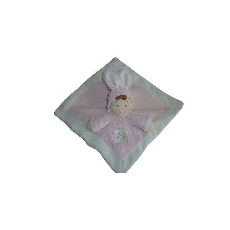 Doudou poupée déguisé en lapin plat 22x22 cm environ, rose crème. Etat : Très bon état (étiquette de la marque coupée). DOUDOU DIFFICILE A TROUVERRecipient :