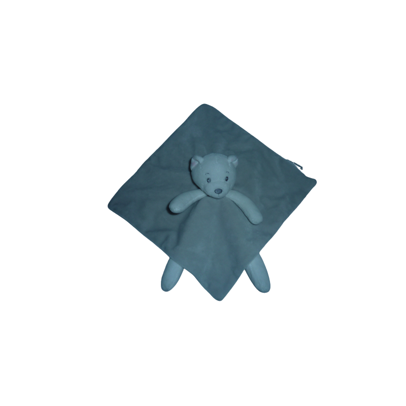 Doudou plat ours 24x24 cm environ, jambes apparentes, grelot, gris blanc motif étoiles. Etat : Neuf sans étiquette boutique. DOUDOU DIFFICILE A TROUVERRecipient :