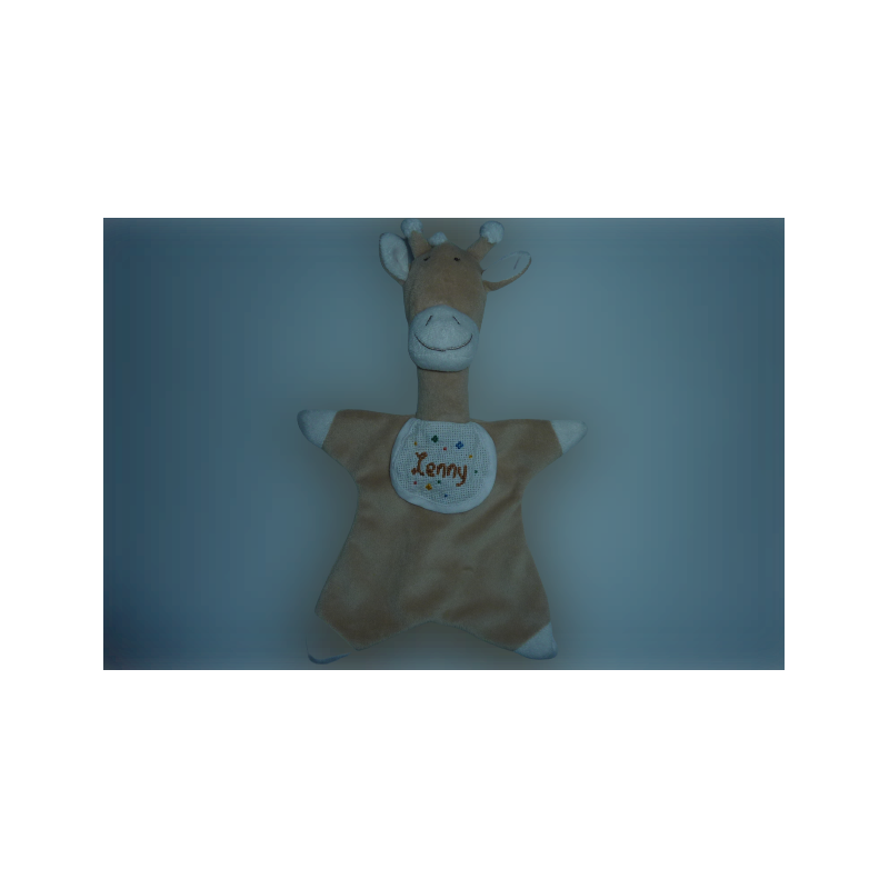 Doudou plat girafe 29 cm environ, marron, bavoir brodé au prénom de Lenny. Etat : Comme neuf (étiquette de la marque coupée). DOUDOU DIFFICILE A TROUVER