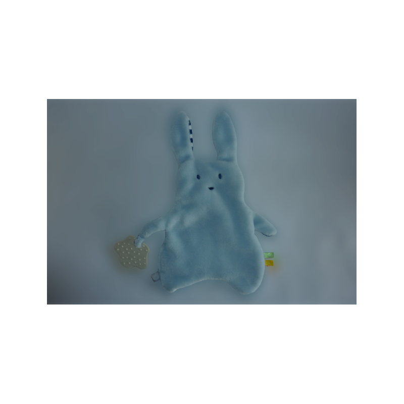 Doudou plat bleu et rayures bleu blanc, anneau de dentition, 33 cm environ. Etat : Comme neuf. DOUDOU DIFFICILE A TROUVER