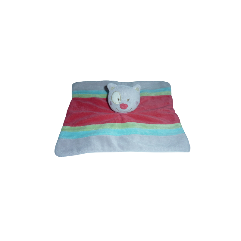 Doudou plat chat 25x25 cm environ, rouge vert bleu gris. Etat : Bon état. DOUDOU DIFFICILE A TROUVERRecipient :