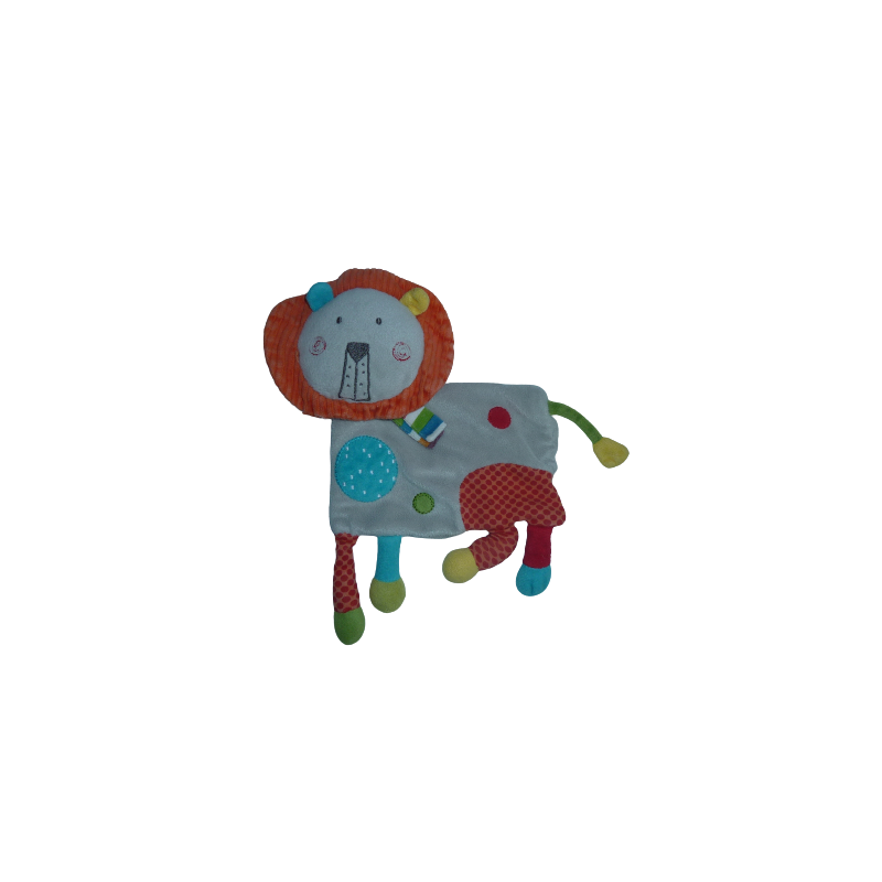 Doudou plat lion multicolore, 27 cm environ (de la tête à la patte la plus longue). Etat : Etat correct pour doudou de secours (marques d'usure sur la crinière, rien de méchant et étiquette de la marque coupée). DOUDOU DIFFICILE A TROUVER