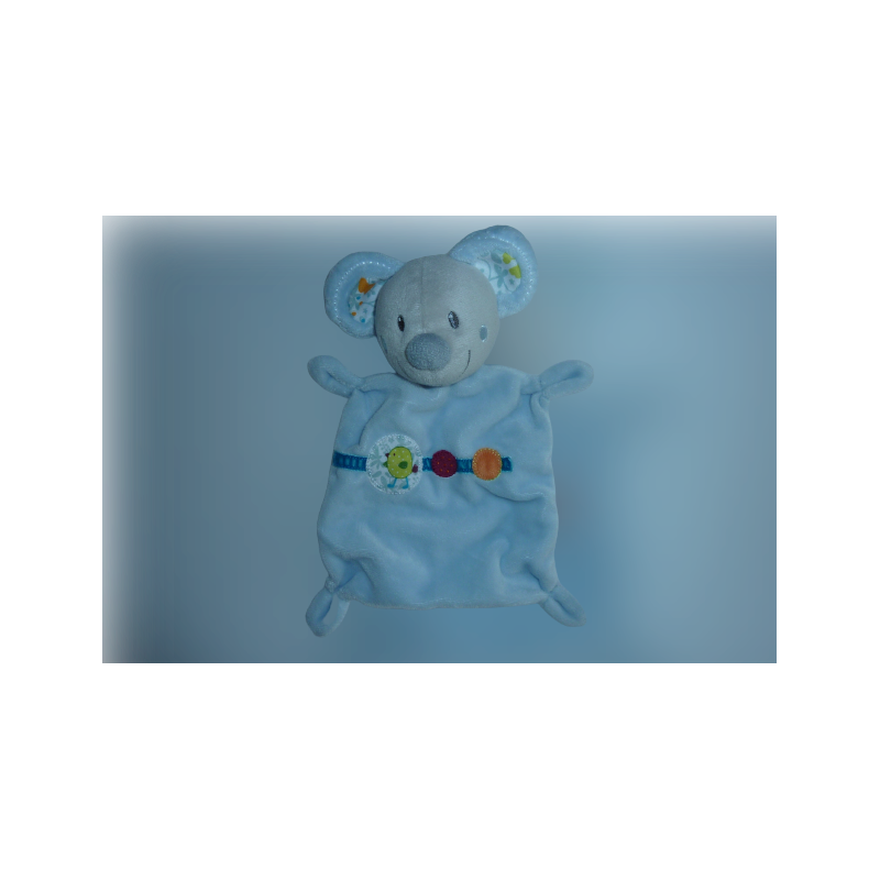 Doudou plat souris 24 cm environ, bleu. Etat : Comme neuf (étiquette de la marque coupée)Recipient :