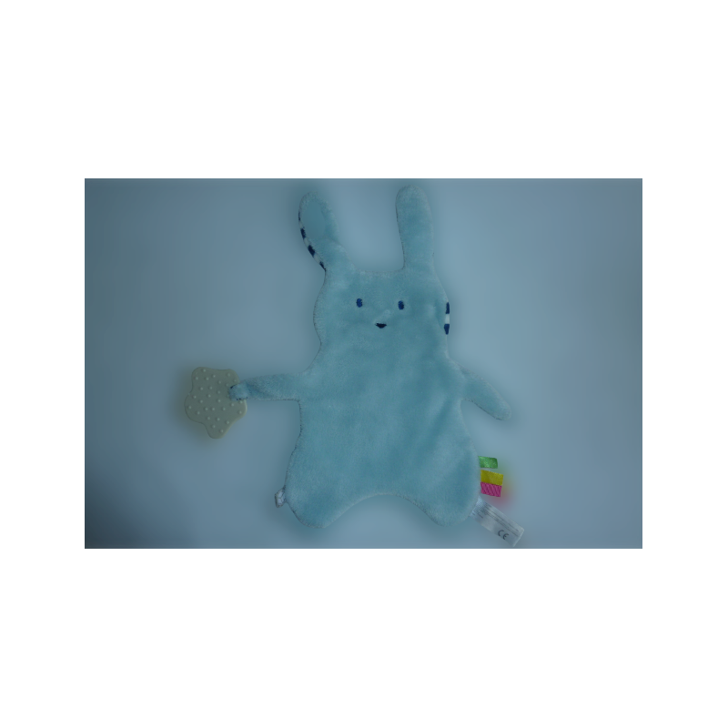 Doudou plat lapin 32 cm environ, anneau de dentition, bleu et rayures bleu blanc. Etat : Bon état