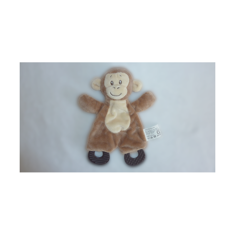 Doudou plat singe 24 cm environ, marron beige, anneaux de dentition, matière bruissante. Etat : Comme neufRecipient :