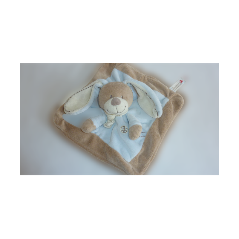 Doudou plat lapin 22x22 cm environ, bleu marron. Etat : Comme neuf
