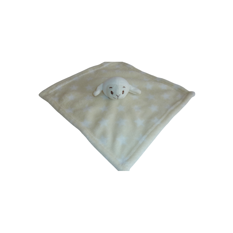 Doudou plat mouton 30x30 cm environ, grelot, crème blanc motif étoiles. Etat : Très bon état