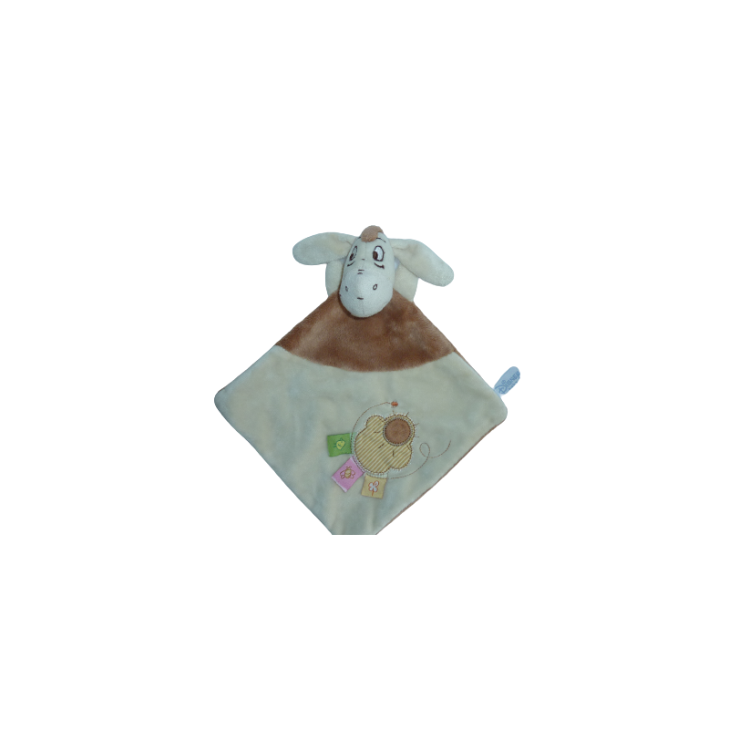 Doudou plat âne Bourriquet forme losange 30 cm environ, marron crème. Etat : Très bon état (juste un petit défaut sur une oreille : moins doux au toucher que l'autre), n'a jamais servi ce doudou