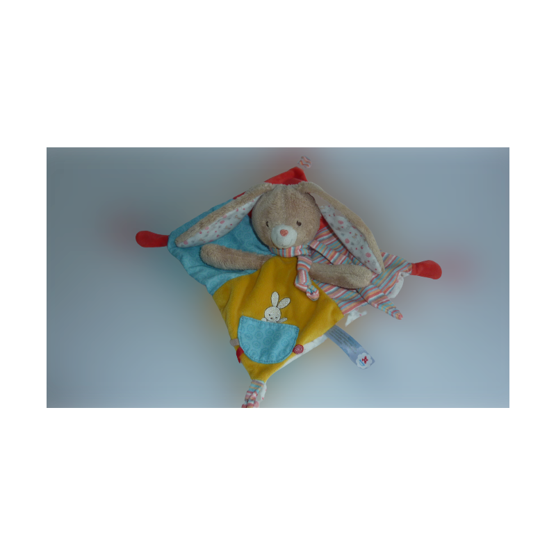 Doudou plat lapin 22x22 cm environ, multicolore.Etat : Très bon état quelques bouloches sur une partie du doudou